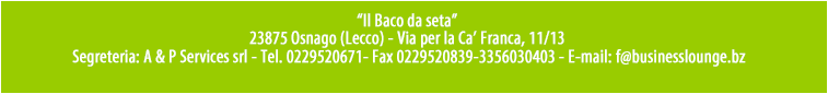 Ai sensi DLGS 196/2003 sulla "tutela dei dati personali", si dichiara di aver liberatamente preso atto che: I dati personali richiesti verrano utilizzati a fini statistici, di ricerca e per comunicare l'esito di eventuali richieste. Esprimo il mio impegno a comunicarvi tempestivamente le eventuali rettifiche, variazioni e/o integrazioni dei dati in vostro possesso e mi dichiaro a conoscenza che il testo completo DLGS 196/2003 relativo ai diritti dell'interessato è disponibile presso la sede di "Il baco da seta" e che mi sarà inviato in caso di mia richiesta. In alternativa è possibile visualizzare il testo completo direttamente dal sito web del Garante per la protezione dei dati personali cliccando